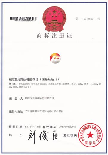 朝陽(yáng)市金麟鐵精粉有限公司“企業(yè)徽標(biāo)”商標(biāo)注冊(cè)成功,是公司品牌建設(shè)的重要里程碑,這標(biāo)志著我公司開始走上品牌發(fā)展之路,真正建立起了走向市場(chǎng)的“名片”,也是公司信譽(yù)和質(zhì)量的象征,將促進(jìn)我們不斷提升服務(wù)水平和商品質(zhì)量,公司一直以“開拓創(chuàng)新,精益求精,精細(xì)管理,優(yōu)質(zhì)服務(wù)”的質(zhì)量方針,為創(chuàng)造強(qiáng)勢(shì)品牌和公司可持續(xù)發(fā)展奠定堅(jiān)實(shí)基礎(chǔ)。